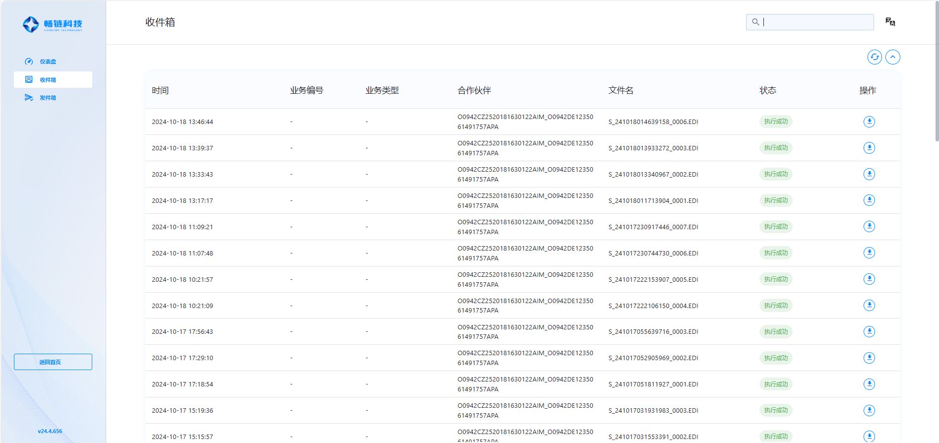 收件箱用于集中查看所有接收到的报文信息,展示的关键内容包括接收时间、合作伙伴ID以及报文处理状态。每条接收的报文均配有下载按钮,用户可通过点击该按钮下载并查看详细内容,确保重要信息及时获取和处理。