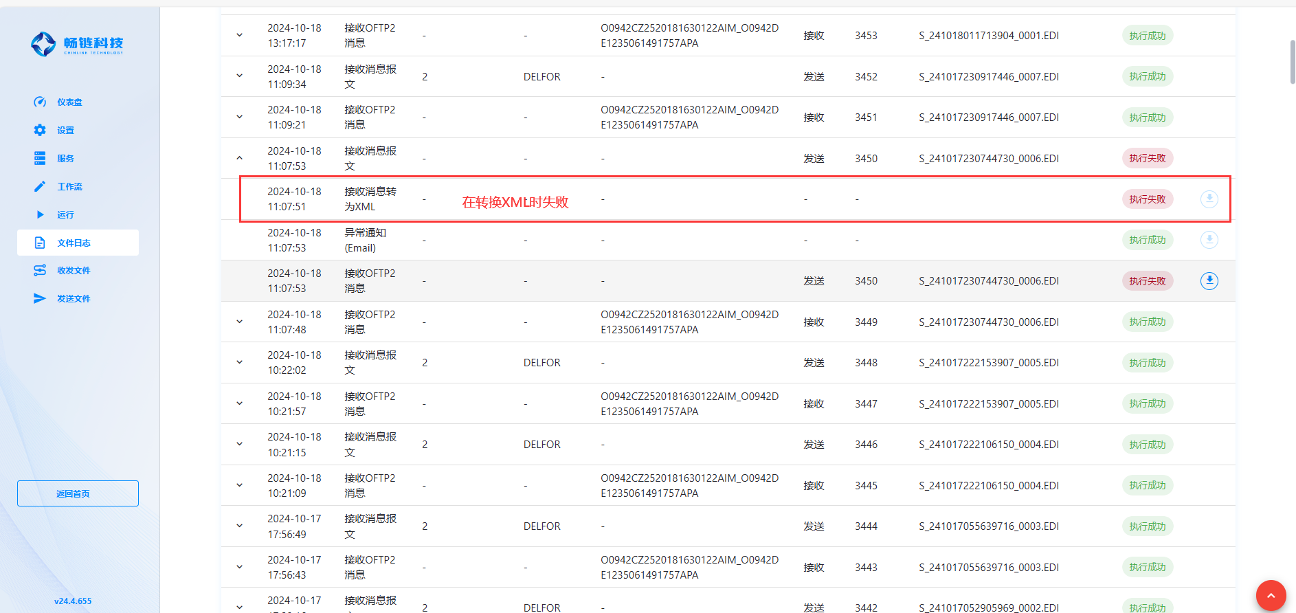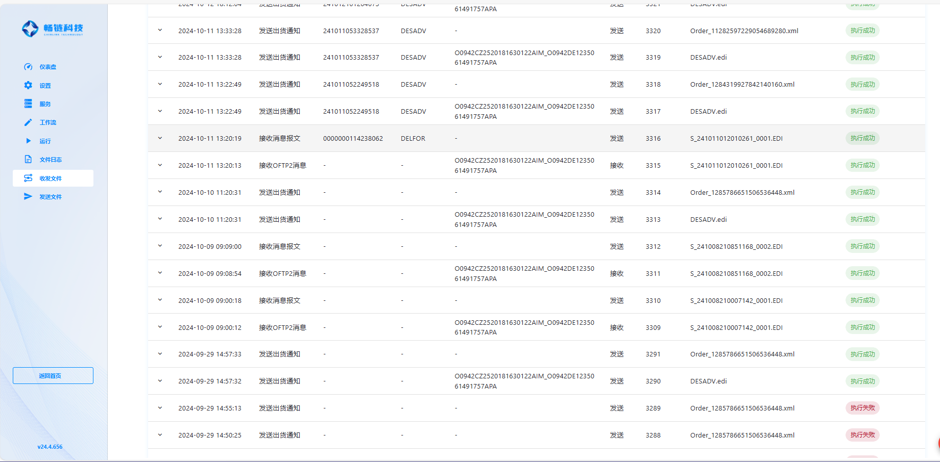 除了上述功能之外,我们还提供了文件日志功能,用户可在自己发送给合作伙伴或者合作伙伴发送给自己报文之后查看对应的文件日志,这其中包含了发送/接收文件的详细情况,每个报文的收发都会放在一个独立的文件夹,其中的 task.log 文件详细记录了成功/失败的日志情况,失败的日志会详细说明是在哪个环节出的问题。
