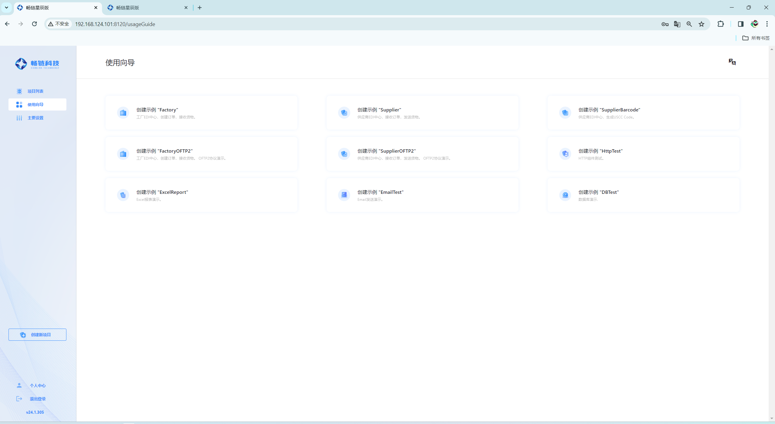 当前支持 9 种向导任务,分别是 AS2 协议任务的工厂 EDI(1 种)和供应商(2 种)示例、OFTP2 协议任务的工厂和供应商示例、HTTP 组件示例、Excel 报表示例、Email 邮件发送示例以及数据库 DB 示例。