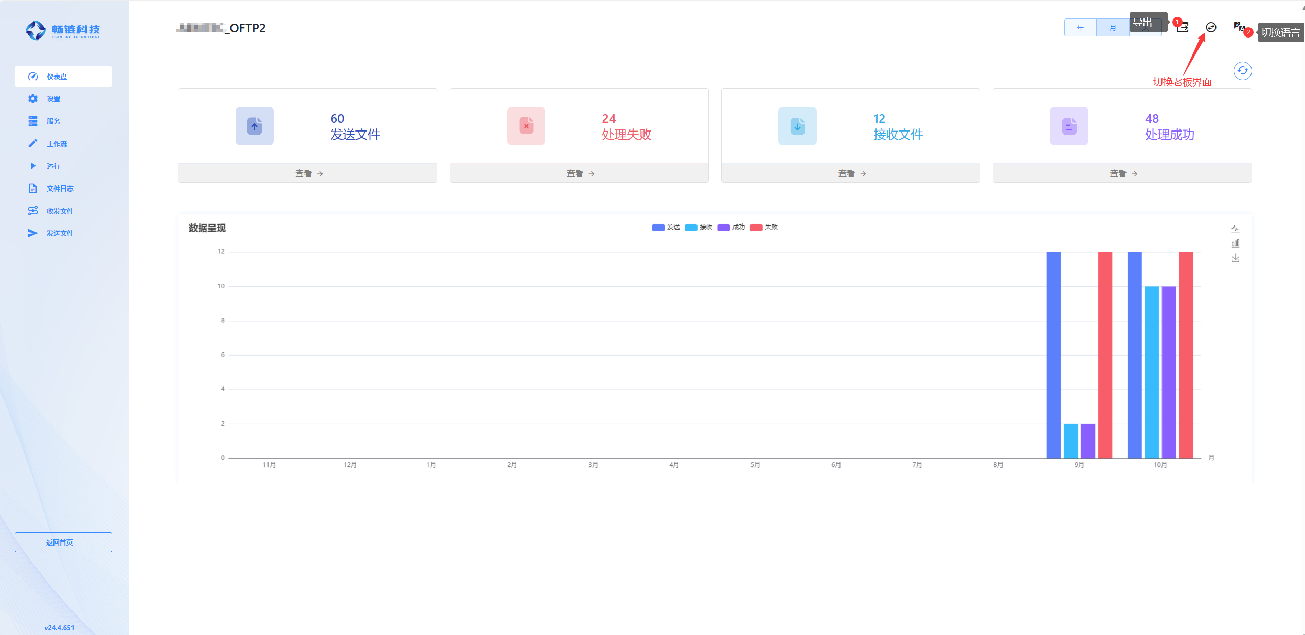 业务功能主界面,包含左侧导航菜单和右侧导航菜单内容显示,默认显示仪表盘界面,右上角三个模块对应功能分别是导出此项目,切换老板界面、切换语言。