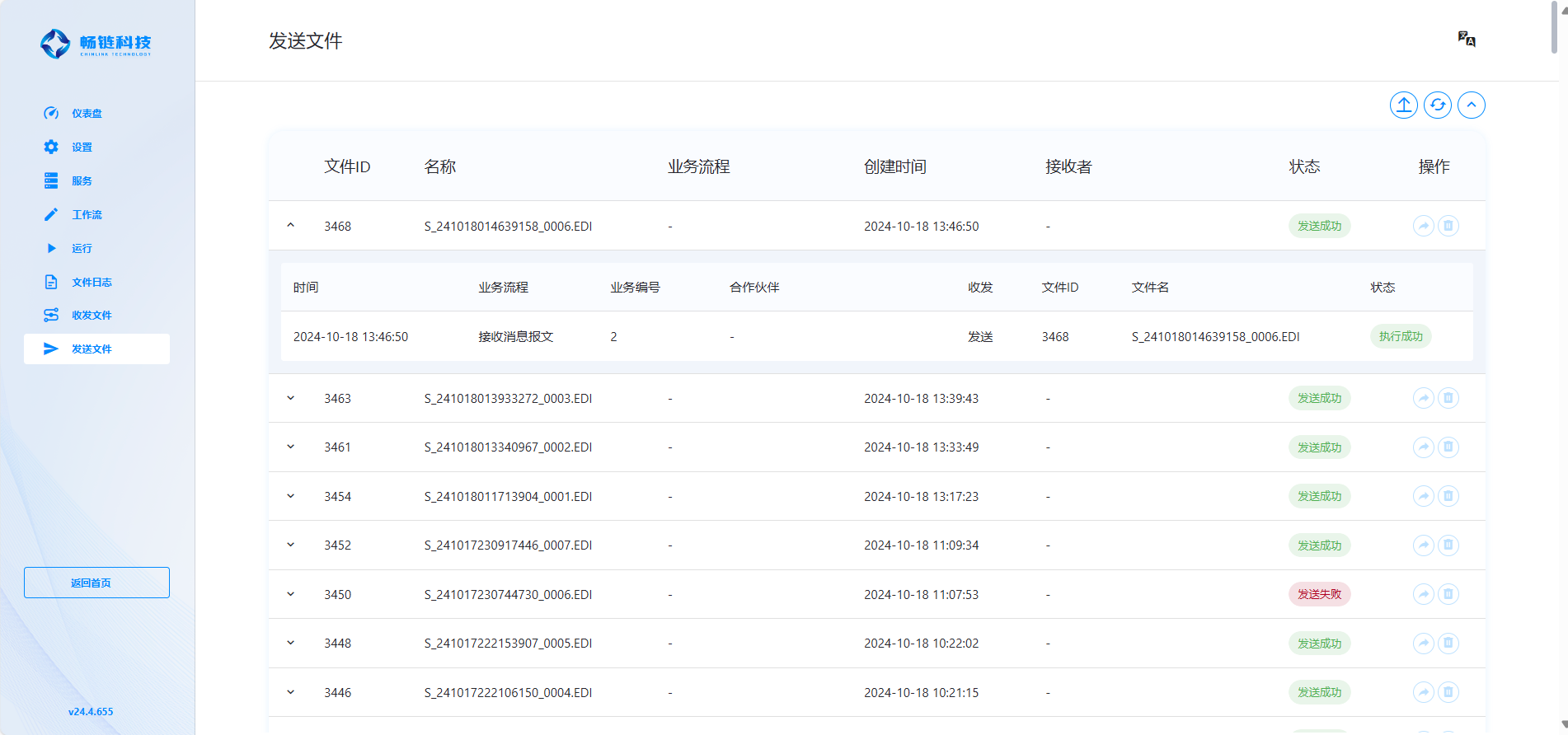 发送文件界面主要用来向合作伙伴发送报文消息,发送完成后,用户可在此界面或仪表盘上立即查看发送文件的状态。