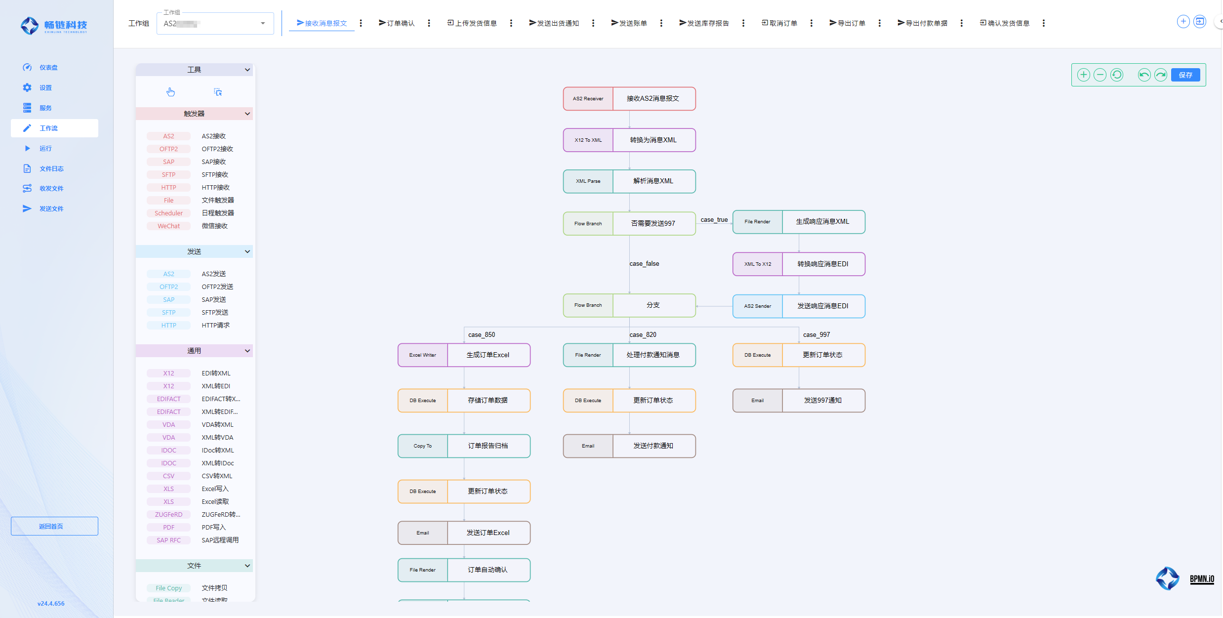 工作流界面允许用户根据特定需求自定义报文处理流程。用户可以建立多个工作组,每个工作组可以代表一个合作伙伴。