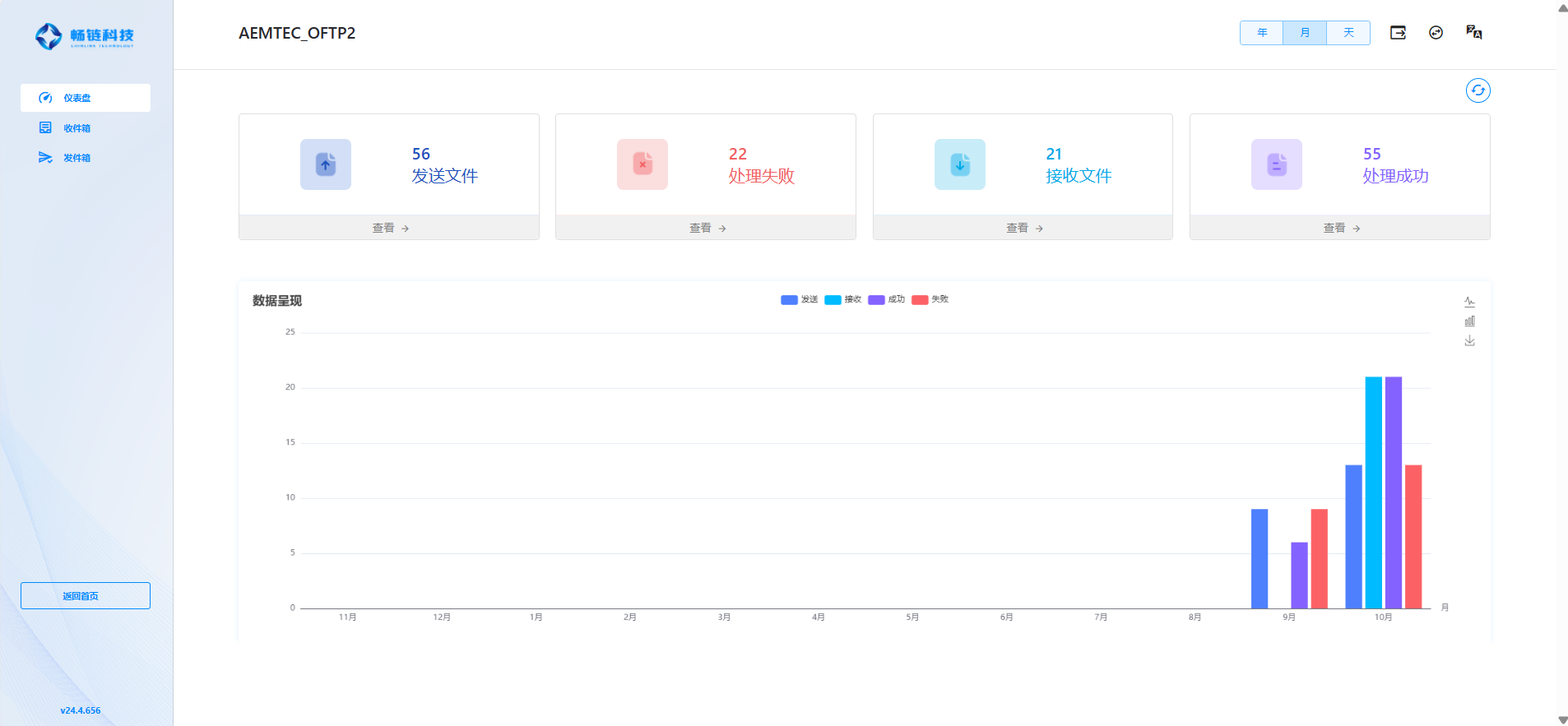 仪表盘界面包含 EDI 传输数据的统计,用于统计发送、接收、成功和失败的文件数。