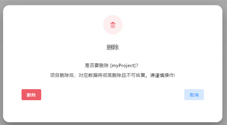 项目删除 - 鼠标悬浮到项目列表中的创建时间后的删除键时(默认不可见,光标悬浮后显示),可显示删除按钮,用于删除该项目(删除项目属于高危操作,删除后,对应项目数据将彻底删除,且不可恢复,请谨慎操作。如确认需要删除,请提前备份项目数据)。