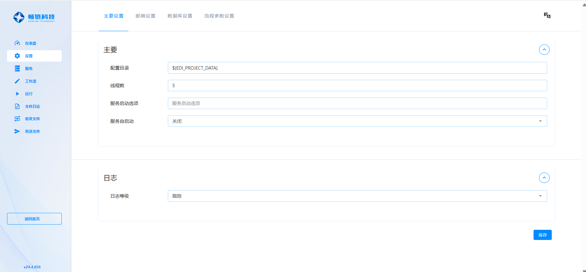 设置界面分为 3 大模块:主要设置、邮箱设置、数据库设置。