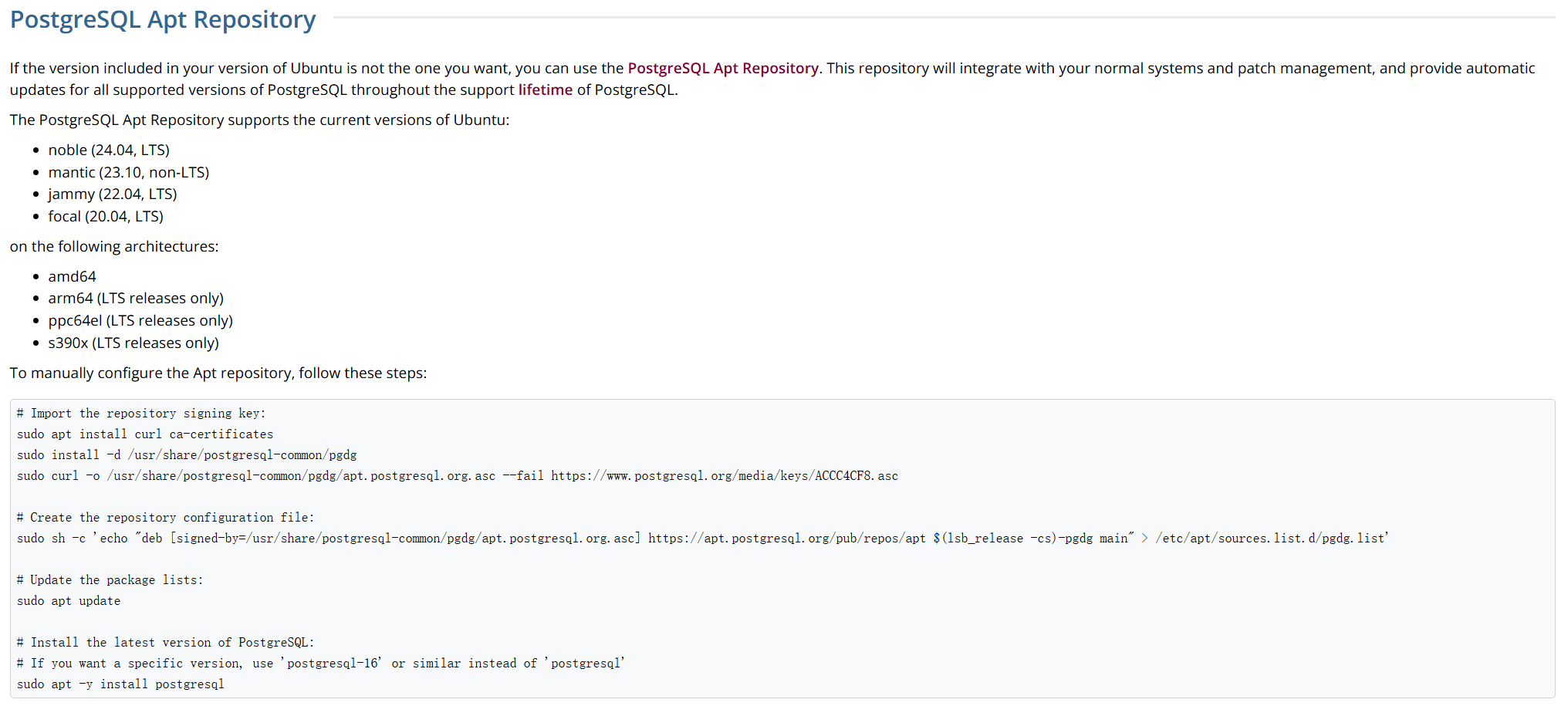 sudo sh -c 'echo "deb [signed-by=/usr/share/postgresql-common/pgdg/``apt.postgresql.org``.asc] ``https://apt.postgresql.org/pub/repos/apt`` $(lsb_release -cs)-pgdg main" > /etc/apt/sources.list.d/pgdg.list'
