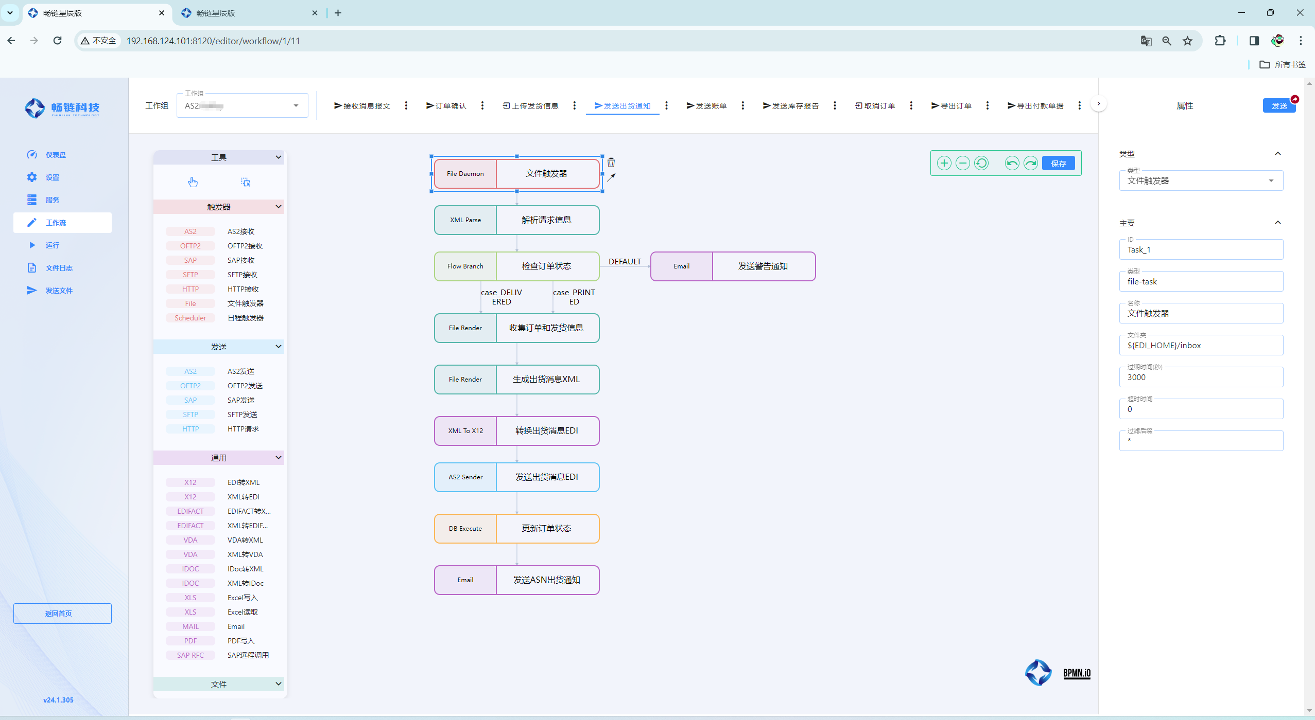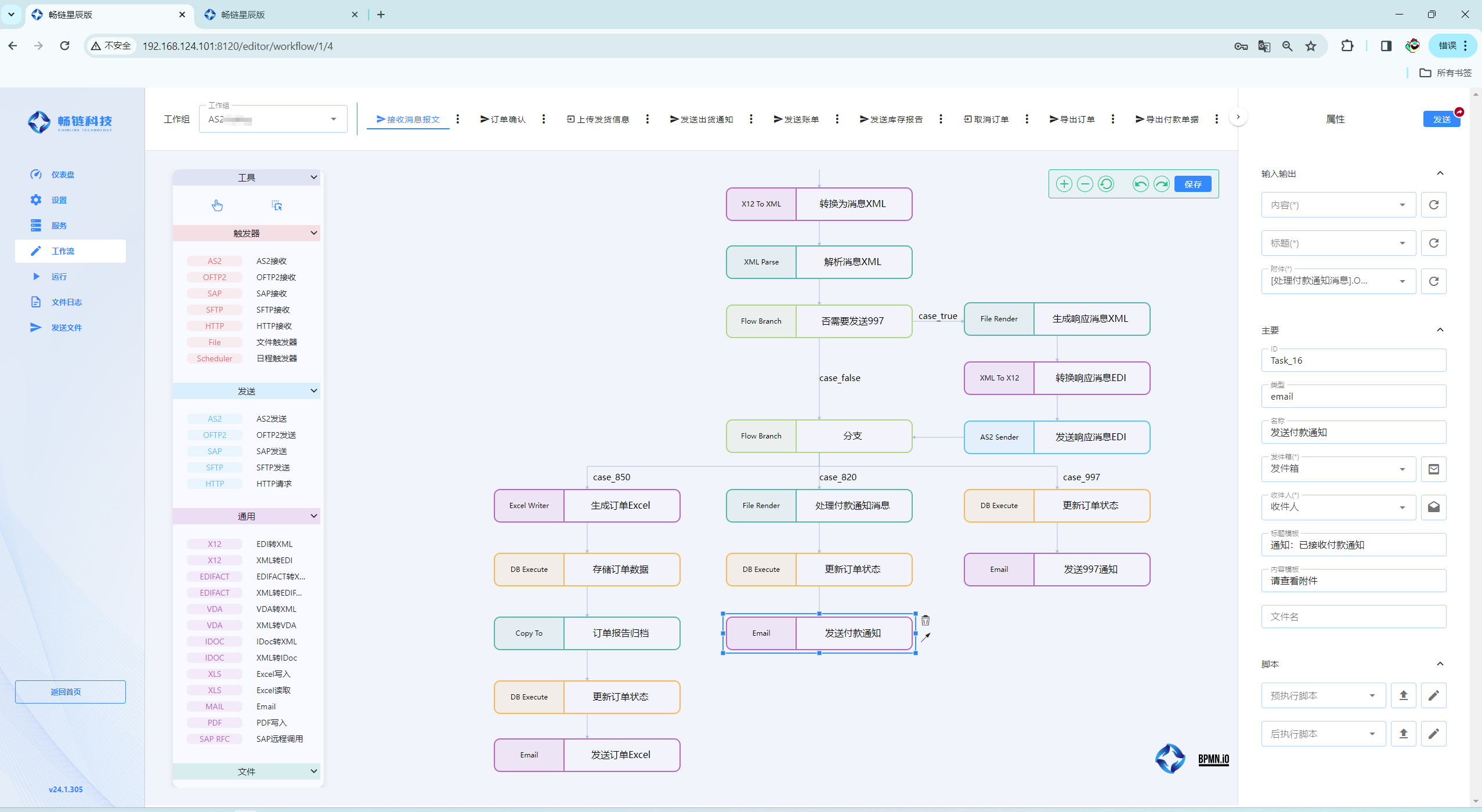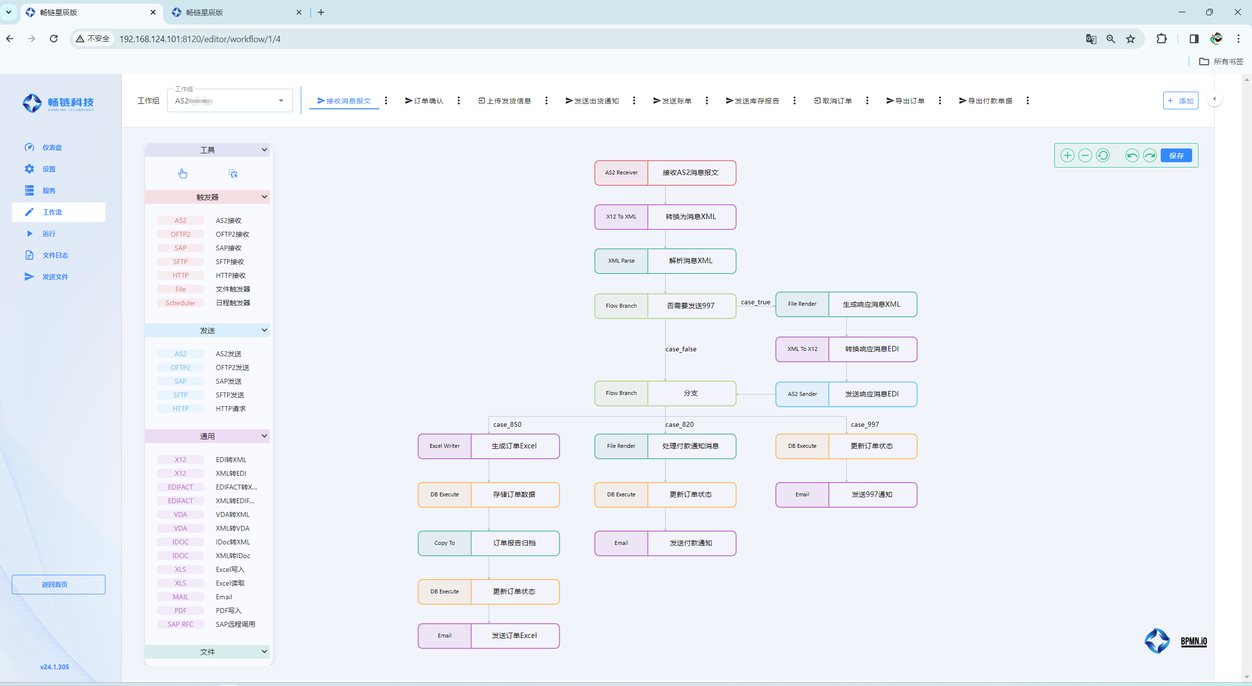 下面是一个接收合作伙伴的 850/820/997 报文的处理流程,如果还需要处理其他类型报文可以再多加几条流程进去即可。