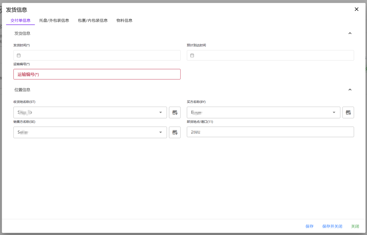 填写托盘/包装信息,包括托盘/包装类型、托盘/包装标签编号等。