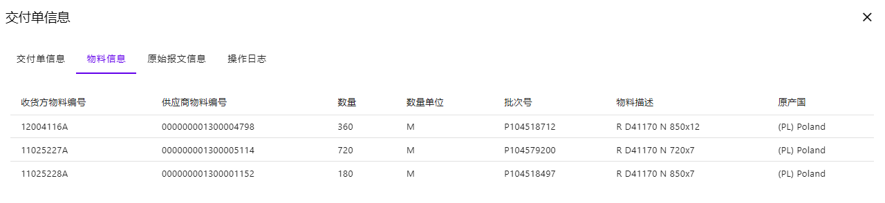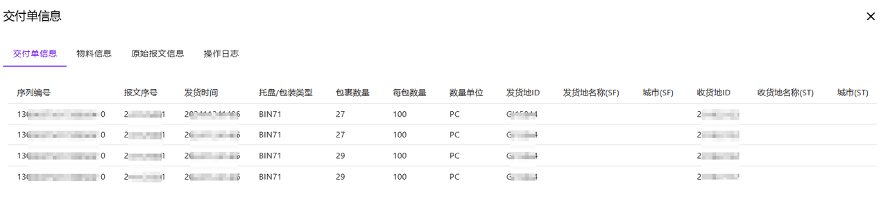 已处理状态的发货信息,表示发货通知已成功发送给客户。界面点击序列编号,可以查询具体的交付单信息和物料信息。