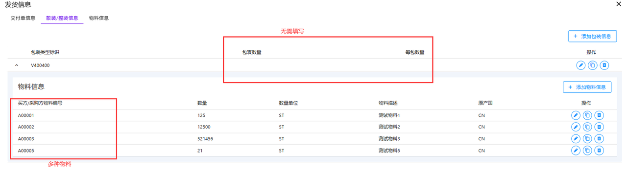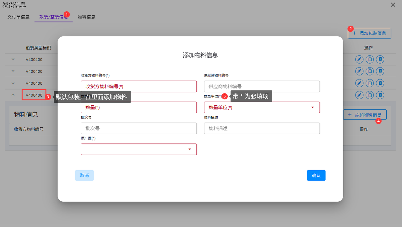 默认包装 V400400 无需填写上述包裹数量和每包数量,直接确认,在其中添加物料即可,一个包装可以填写多个不同的物料。