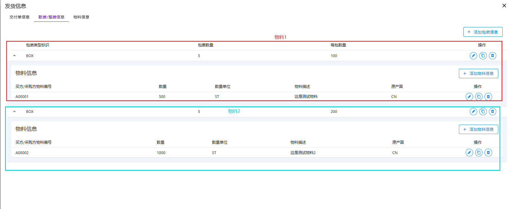 可回收包装在填写包装信息时,需要将包装类型选为 BOX,而且需要填写包裹数量和每包数量。除此之外,在每个包装之下只能有一种物料,如果此交付单存在多个物料则需要有多个包装。