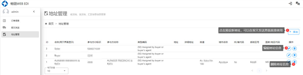地址管理界面:用于预先配置地址信息,包括发货地、收货地等内容,在报文生成过程中快速调用。